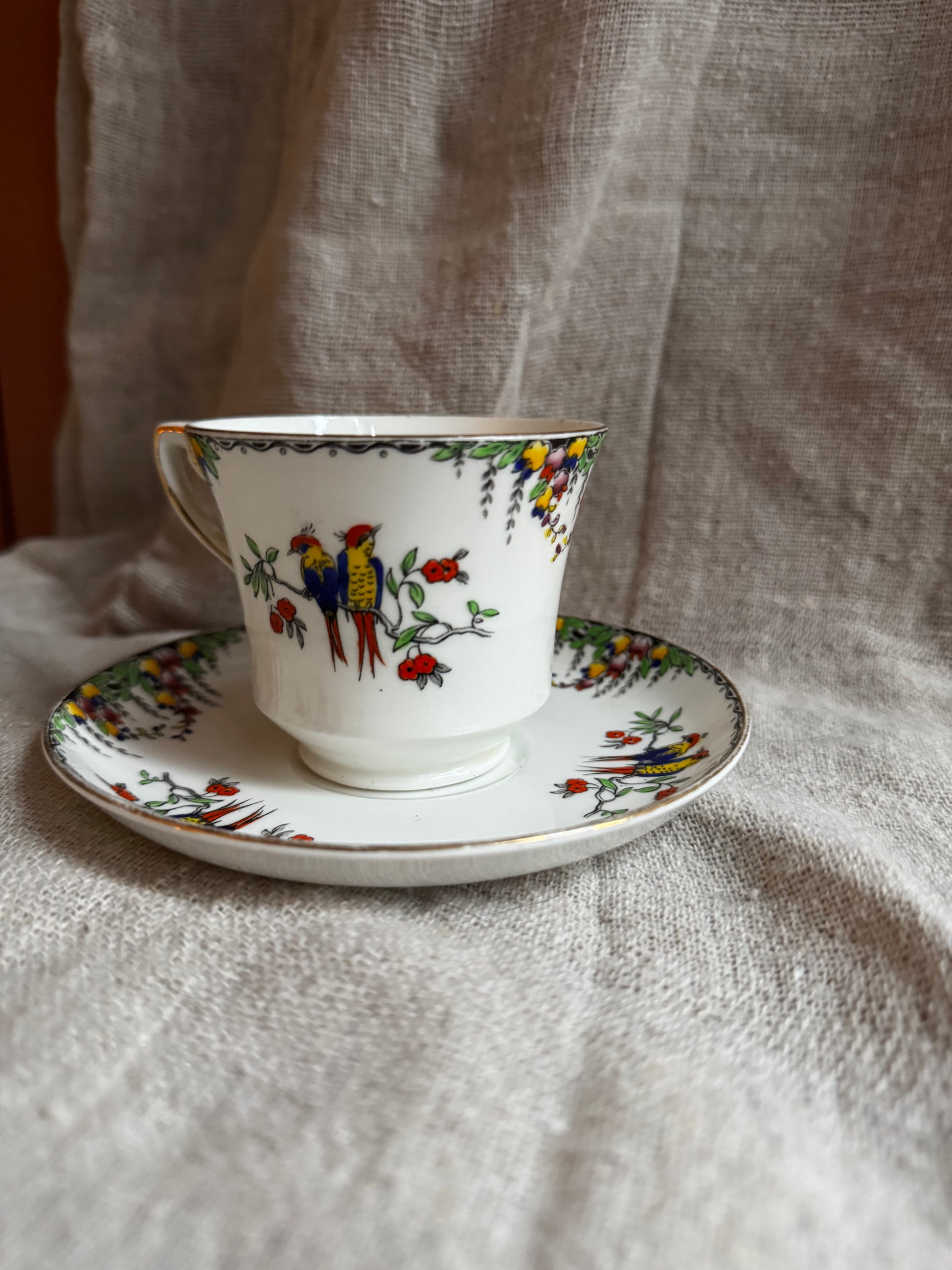 A delicate vintage teacup and saucer adorned with hand-applied bird and floral motifs, finished with a fine gold rim. Light, elegant, and beautifully balanced in the hand, this is the kind of everyday piece that quietly elevates a morning tea or afternoon pause.